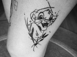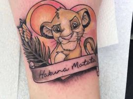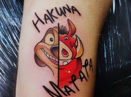 - стремление жить легкой, простой жизнью. Это значение полностью противоречит предыдущему. Но это неудивительно. В жизни Симбы был период, когда он разделял принцип «акуна-матата», то есть просто получал удовольствие от каждого момента и не думал о будущем. Обычно такие тату представляют собой «групповой портрет» льва Симбы, кабана Пумбы и суриката Тимона.