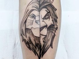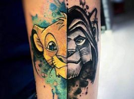Хорошою ідеєю стане використання реалістичного стилю та поєднання його з традиційним для Діснея малюванням. Наприклад, цікаво виглядає ескіз, на якому лев немов розділений на дві частини: анімаційну та реалістичну. Аналогічну ідею можуть використовувати і любителі геометрії та мінімалізму. У цьому випадку друга половина лева виконується у відповідній стилістиці. Це робить тату більш оригінальним і позбавляє ризику побачити на комусь аналогічне зображення.