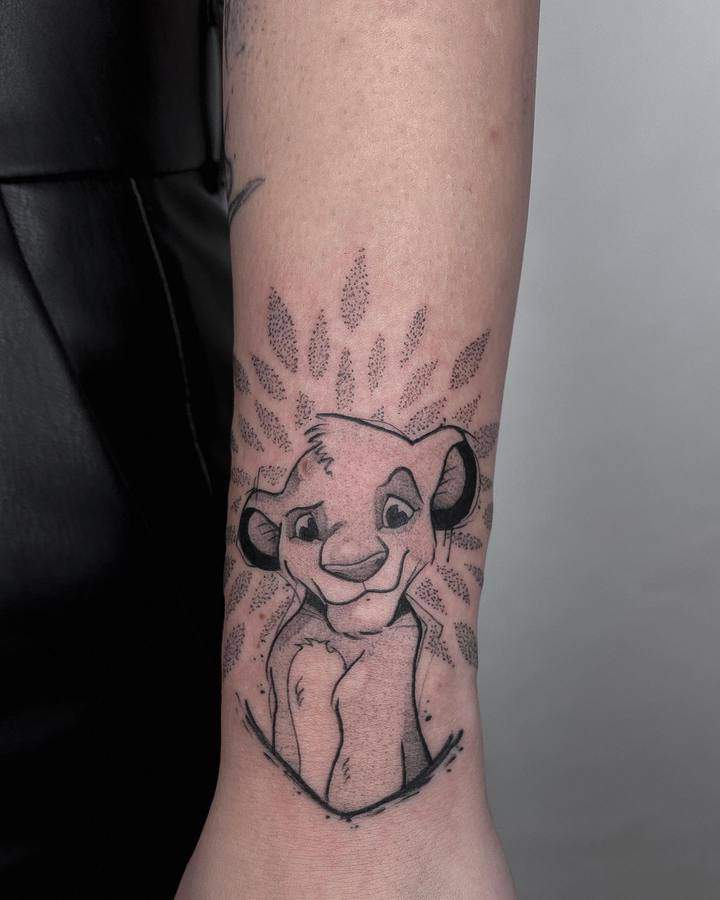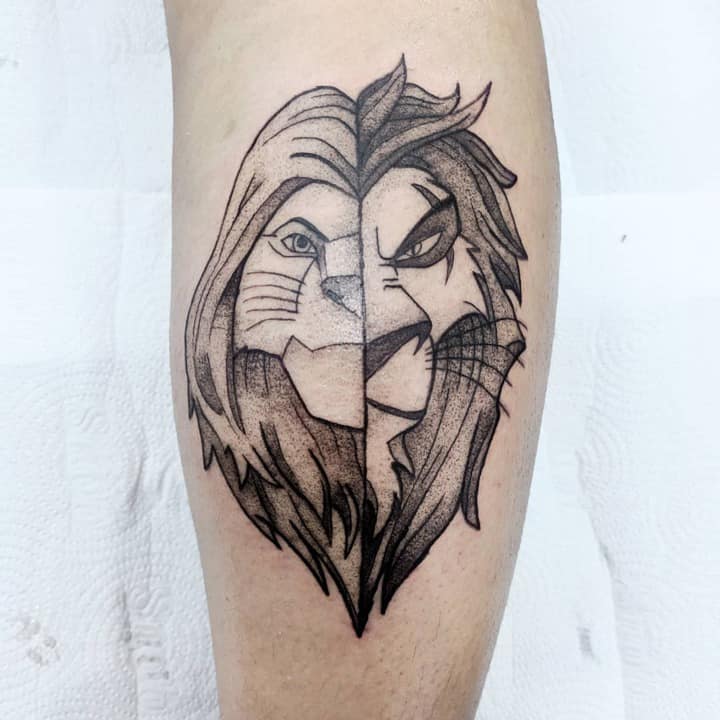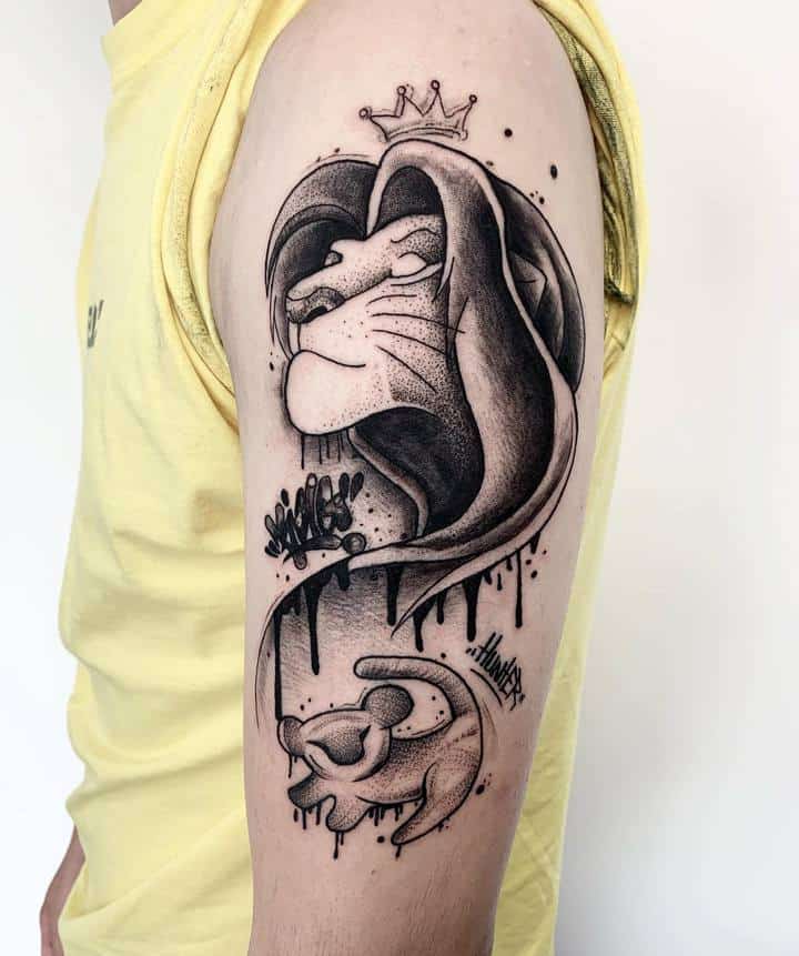 Хорошою ідеєю стане використання реалістичного стилю та поєднання його з традиційним для Діснея малюванням. Наприклад, цікаво виглядає ескіз, на якому лев немов розділений на дві частини: анімаційну та реалістичну. Аналогічну ідею можуть використовувати і любителі геометрії та мінімалізму. У цьому випадку друга половина лева виконується у відповідній стилістиці. Це робить тату більш оригінальним і позбавляє ризику побачити на комусь аналогічне зображення.