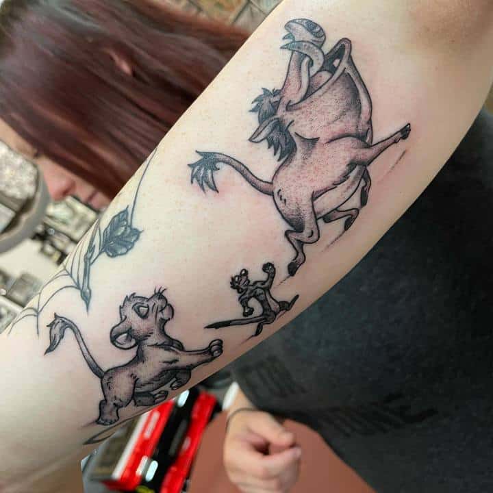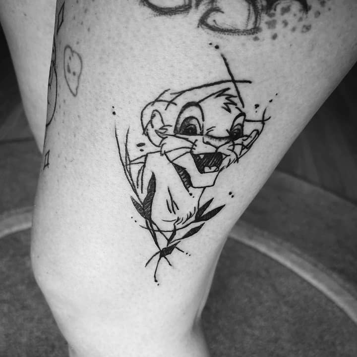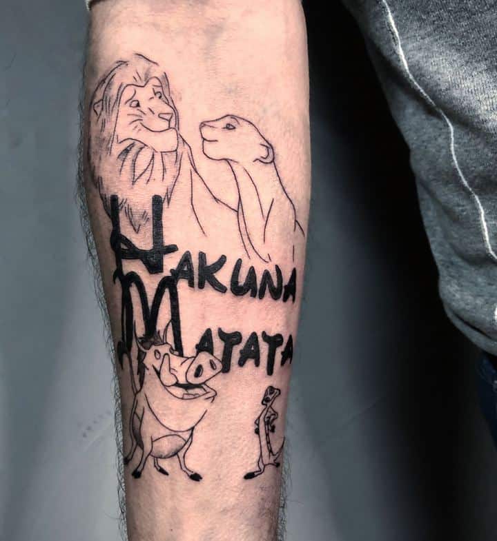 - стремление жить легкой, простой жизнью. Это значение полностью противоречит предыдущему. Но это неудивительно. В жизни Симбы был период, когда он разделял принцип «акуна-матата», то есть просто получал удовольствие от каждого момента и не думал о будущем. Обычно такие тату представляют собой «групповой портрет» льва Симбы, кабана Пумбы и суриката Тимона.