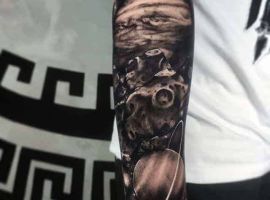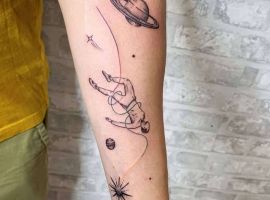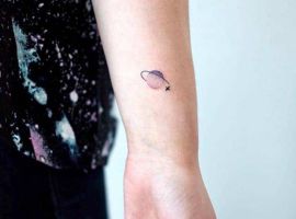 Планеты тату могут быть выполнены в любом стиле. Эффектно и необычно смотрится тату галактика на руке в виде рукава. Эскиз можно сделать интереснее, если добавить изображения футуристических космических кораблей, летающих в космосе.