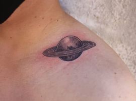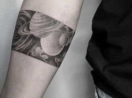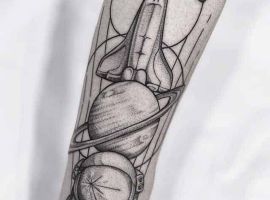 ЧБ татуировки обычно выполняются в графическом стиле. Чтобы работа выглядела интереснее, можно дополнить ее «акварельными разводами». Очень красиво выглядит графика с Сатурном, имеющим эффектные кольца, которые могут быть цветными. В кольца можно вписать любую надпись, например, свой жизненный девиз или любимое латинское изречение.