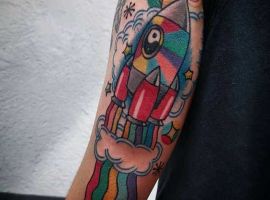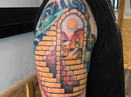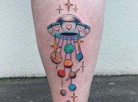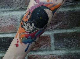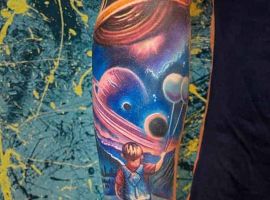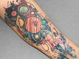 Цветные татуировки на космическую тему можно делать в любых стилях. Необычно выглядят в стилистике треш-полька. Их главная особенность состоит в использовании ограниченной цветовой гаммы (черный, оттенки серого и красного) и сочетании реалистичного стиля с надписями и символами. В таком стиле можно сделать рукав или тату планеты на спине.