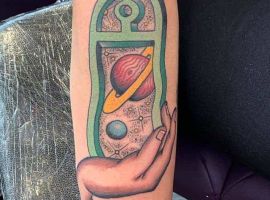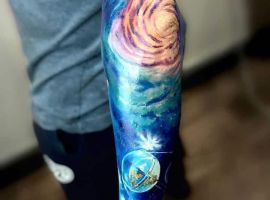 Цветные татуировки на космическую тему можно делать в любых стилях. В реализме можно сделать рукав или тату планеты на спине.