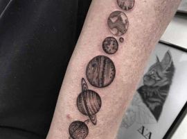Если хочется, чтобы на изображении были все планеты татуировка может быть размещена на позвоночнике. Около шеи можно разместить изображение Солнца, что придаст изображению завершенность. Вместо реалистичных изображений, можно выбрать их астрологические символы, что станет хорошим вариантом для увлекающихся эзотерикой людей.