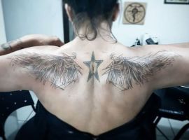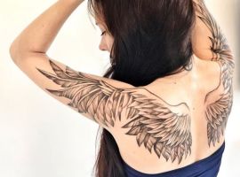 Женские тату имеют несколько иные значения. Многое зависит именно от размера крыльев и манеры их исполнения. Небольшие, аккуратные крылья рассказывают о легкости, изяществе. Отлично смотрятся они на лопатках. В тоже время яркий, реалистичный рисунок говорит о скрытой силе, о том, что женщина может отстоять свои права во что бы то ни стало. Довольно часто тату крылья на спине у девушек комбинируют с другими изображениями, к примеру, ангелами, бабочками. Такой рисунок никого не оставит точно равнодушным, он заставит окружающих остановиться и любоваться девушкой с такой татуировкой на пляже летом.