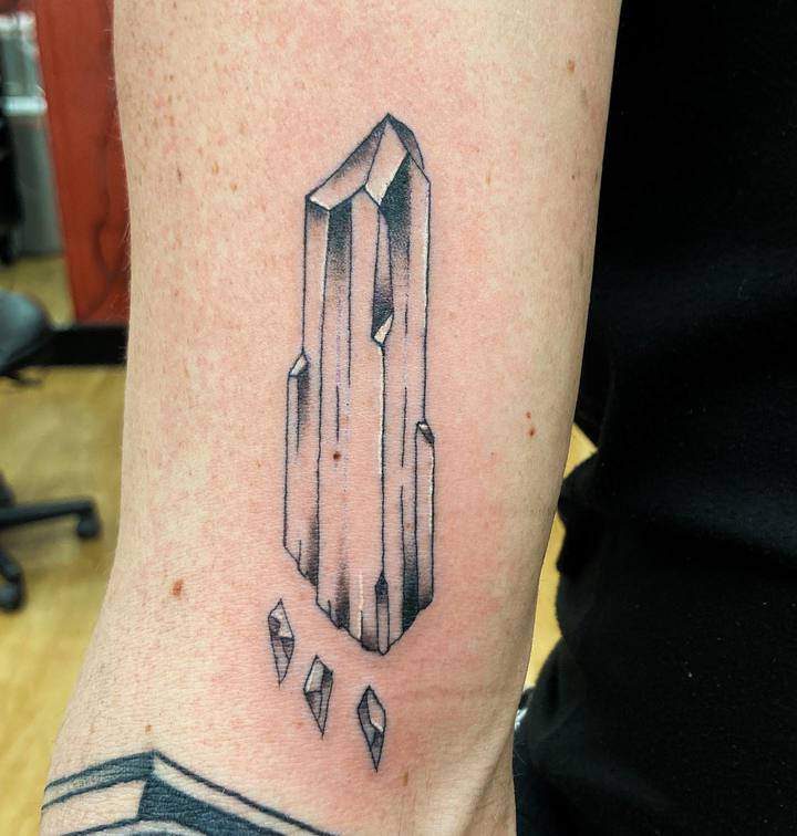 Изображения с кристаллами встречаются одинаково часто как у мужчин, так и у женщин. Обычно это относительно небольшой эскиз на руке, запястье, ключице…Но по сути местом расположения тату можно выбрать совершенно любой участок на теле, в том числе и зону предплечья, бедра, икры.