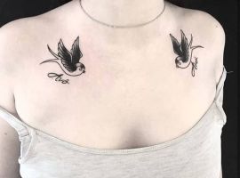 Ласточки одинаково хорошо подходят и для девушек, и для парней. Однако, выглядеть они будут по-разному, и места на теле для такой идеи тоже будут отличаться. Представительницы прекрасного пола предпочитают наносить ее на лопатке, на ключице или на руке. Это самые женственные места. Сюда хорошо ляжет маленькая изящная картинка, которая подчеркнет нежность и романтичность натуры своей владелицы.
