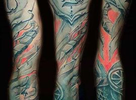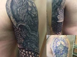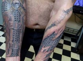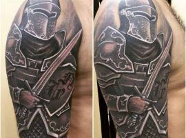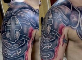 - Доспехи тату в виде сплошного рукава или отдельного фрагмента в области плеча будет говорить о человеке, который хочет отпугнуть от себя лживых людей. Также предплечье идеально для людей, не готовых принимать в свою жизнь врагов. Тату на руке у мужчины кольчуга значение имеет внутренней душевной силы, непоколебимости и энергии сексуальности;