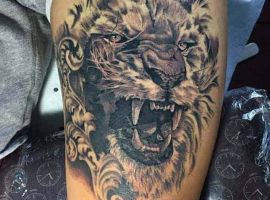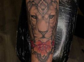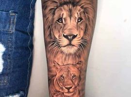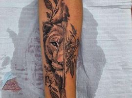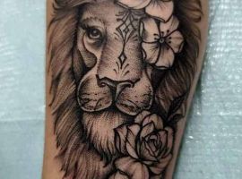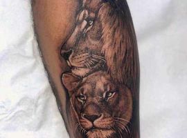 Часто встречается тату лев на ноге. Изображение интересно выглядит на бедре у девушек. Чаще всего, набивают тату львица эскиз, лев и цветы. На икре набивают в большинстве случаев парни.