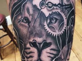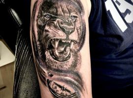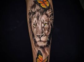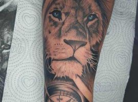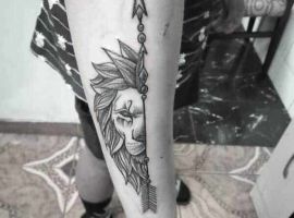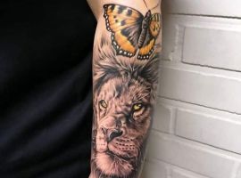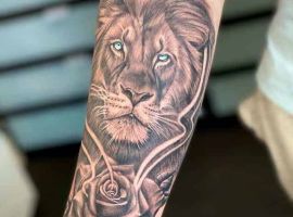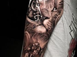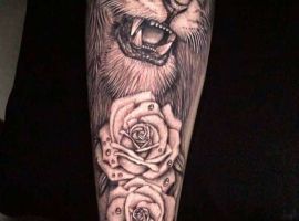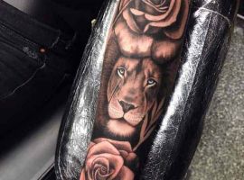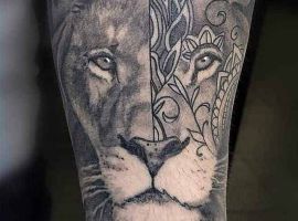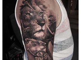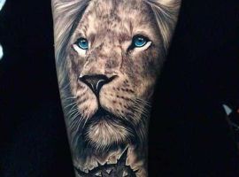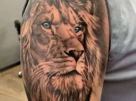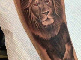 Мужчины предпочитают стиль реализм. Набивают тату льва на плече, как цветным, так и ч.б. Эскизом обычно служит фото зверя. Тату на предплечье мужские или тату льва на ноге интересно будут выглядеть в графике, дотворке, геометрии. На этот момент реалистичная тату лев с элементами геометрии набирает популярности среди клиентов.