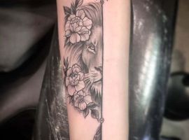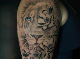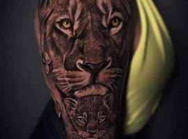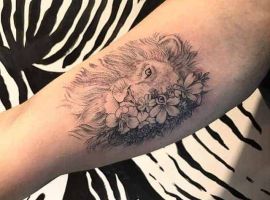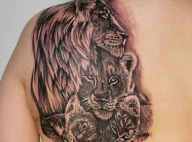 6. Популярным среди девушек является вариант львица с львятами. Такие картинки символизируют материнство, заботу, любовь к своей семье, детям и готовность защитить их любой ценой. Можно еще встретить животное в цветах. Тату львица в этом случае обозначает женственность, красоту, женскую энергию и силу. На основе анализа тысяч выполненных работ тату лев с цветами становится все популярнее среди женщин для выражения баланса силы и нежности.