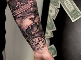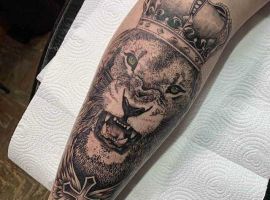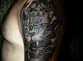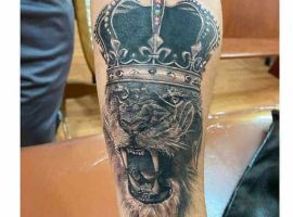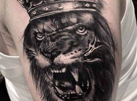 2. Татуировка лев с короной значение будет иметь силы, власти, гордости, благородства. Такая картинка подойдет уверенным в себе и своих силах людям, которые стремятся во всем быть лидерами, первыми. Чаще всего такой вариант выбирают мужчины, делают в черно-белом реализме. Как показывает реальная статистика наших записей, тату лев с короной часто дополняют элементами, как розы, для добавления более глубокого смысла.
