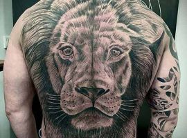 Реже можно встретить тату льва на спине. Очень круто и смело будет выглядеть картинка с хищником на всю спину, но далеко не каждый решится на это. Поэтому выбирают чаще небольшие эскизы со зверем и наносят на определенный участок спины, в основном лопатка. За годы работы мы окончательно убедились, что тату лев на спине часто выбирают для больших композиций с элементами природы.