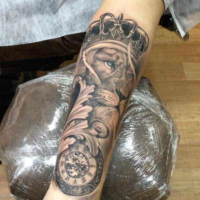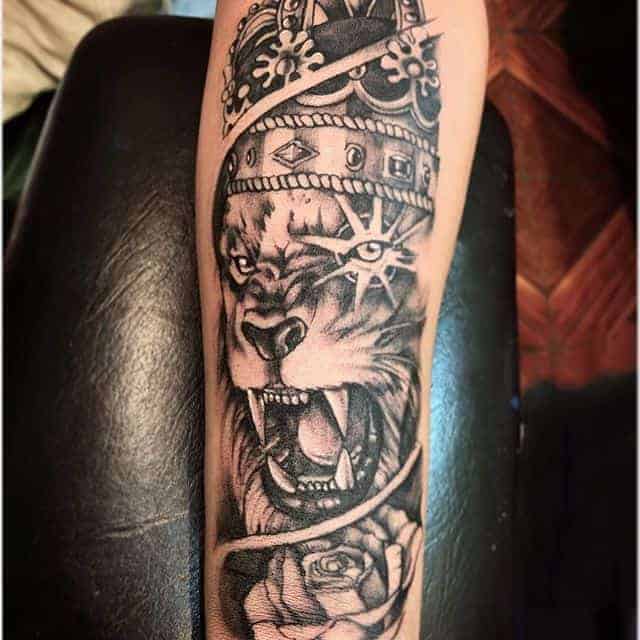 2. Татуировка лев с короной значение будет иметь силы, власти, гордости, благородства. Такая картинка подойдет уверенным в себе и своих силах людям, которые стремятся во всем быть лидерами, первыми. Чаще всего такой вариант выбирают мужчины, делают в черно-белом реализме. Как показывает реальная статистика наших записей, тату лев с короной часто дополняют элементами, как розы, для добавления более глубокого смысла.