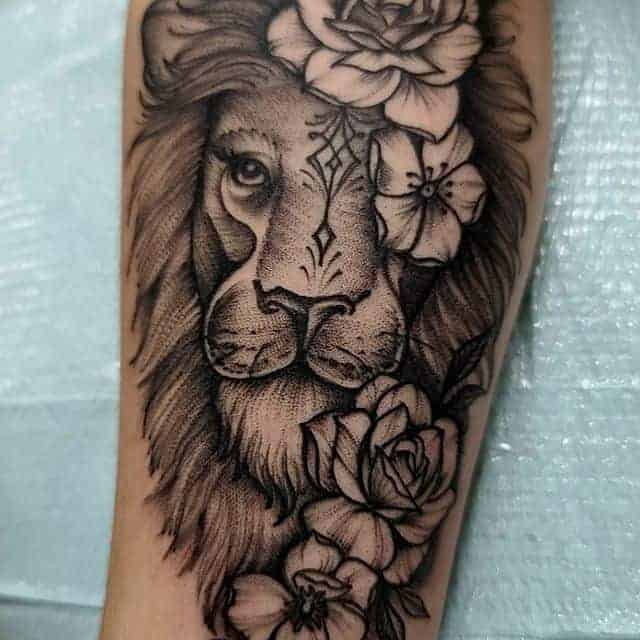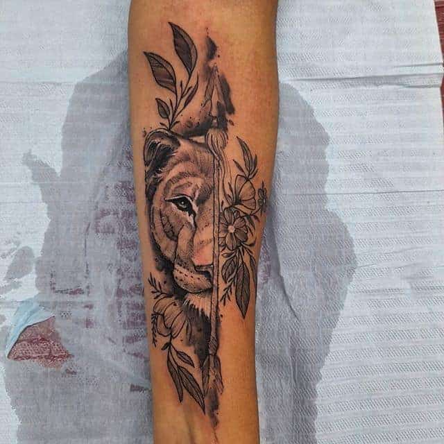Часто встречается тату лев на ноге. Изображение интересно выглядит на бедре у девушек. Чаще всего, набивают тату львица эскиз, лев и цветы. На икре набивают в большинстве случаев парни.