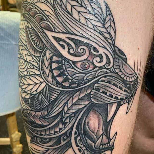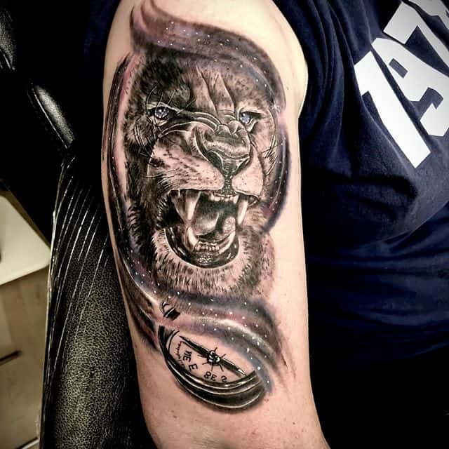 4. Изображение морды зверя с оскалом говорит о том, что его обладатель имеет в характере темную сторону, которая может проявиться в любой момент, если человека раздражать. Интересно, что в обычных условиях вероятно человек будет очень спокойный и тихий, а вот в стрессовой ситуации покажет агрессию и темперамент. Реалистичная тату лев оскал часто выбирают для подчеркивания этой двойственности.