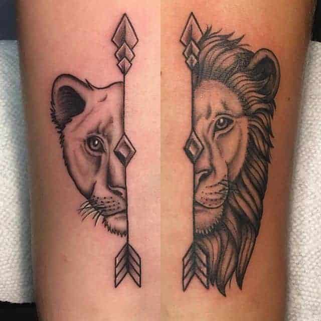 8. Встречаются парные идеи с животным. Например, тату лев на руке мужчины и его женщины. Еще и львята оригинально впишутся в общую композицию на руку их взрослого ребенка.