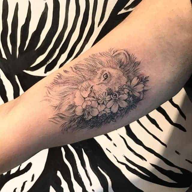 6. Популярным среди девушек является вариант львица с львятами. Такие картинки символизируют материнство, заботу, любовь к своей семье, детям и готовность защитить их любой ценой. Можно еще встретить животное в цветах. Тату львица в этом случае обозначает женственность, красоту, женскую энергию и силу. На основе анализа тысяч выполненных работ тату лев с цветами становится все популярнее среди женщин для выражения баланса силы и нежности.