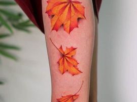Реализации идей татушки также могут быть разным. К примеру, красиво смотрится, когда падает кленовый лист. Тату ведь может быть с 3Д тенью, как будто лист завис над кожей. Отлично смотрится лист с элементами геометрии, абстракции, красивыми надписями и насекомыми.