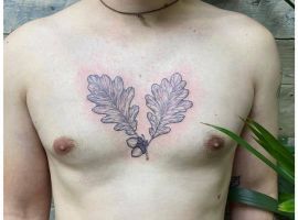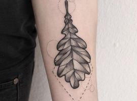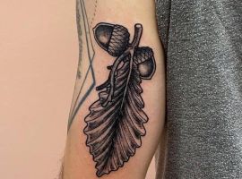 Особенно популярные рисунки с дубовыми листьями. Тату говорит о непоколебимой силе и воле. Во многих странах тату дубовые листья по своему смыслу идентичны наградам с изображением дуба, которые вручаются военным за подвиги. Тату дубовый лист говорить о храбрости, мужестве, ответственности. Лучше всего тату с дубовыми листьями смотрятся на мужском теле.