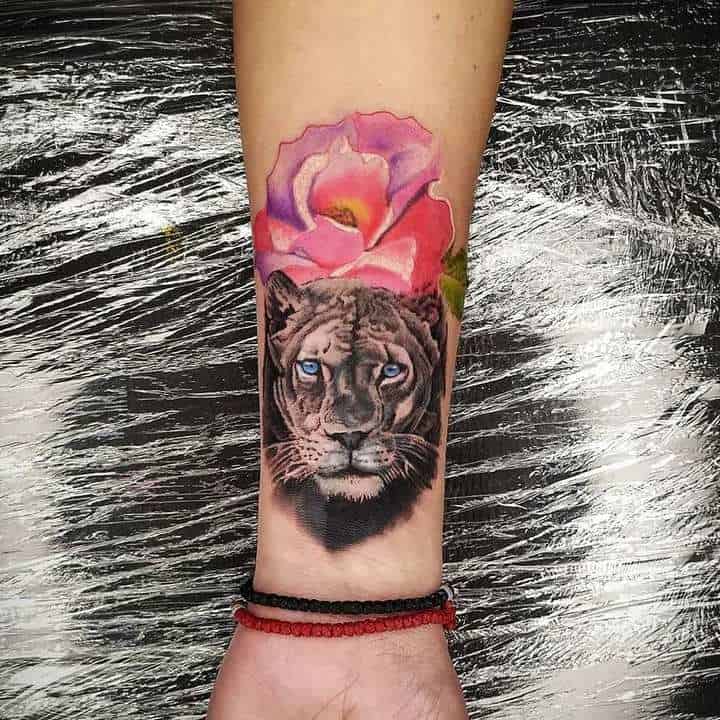 В большинстве случаев подобные татуировки на женском теле являются более спокойными, не подразумевая агрессивность. В качестве дополнительных деталей могут быть нанесены цветы, птицы или фон в виде пейзажа. Это позволяет отразить уверенность в себе и возможность защитить себя, но при этом сохранить женственные черты.