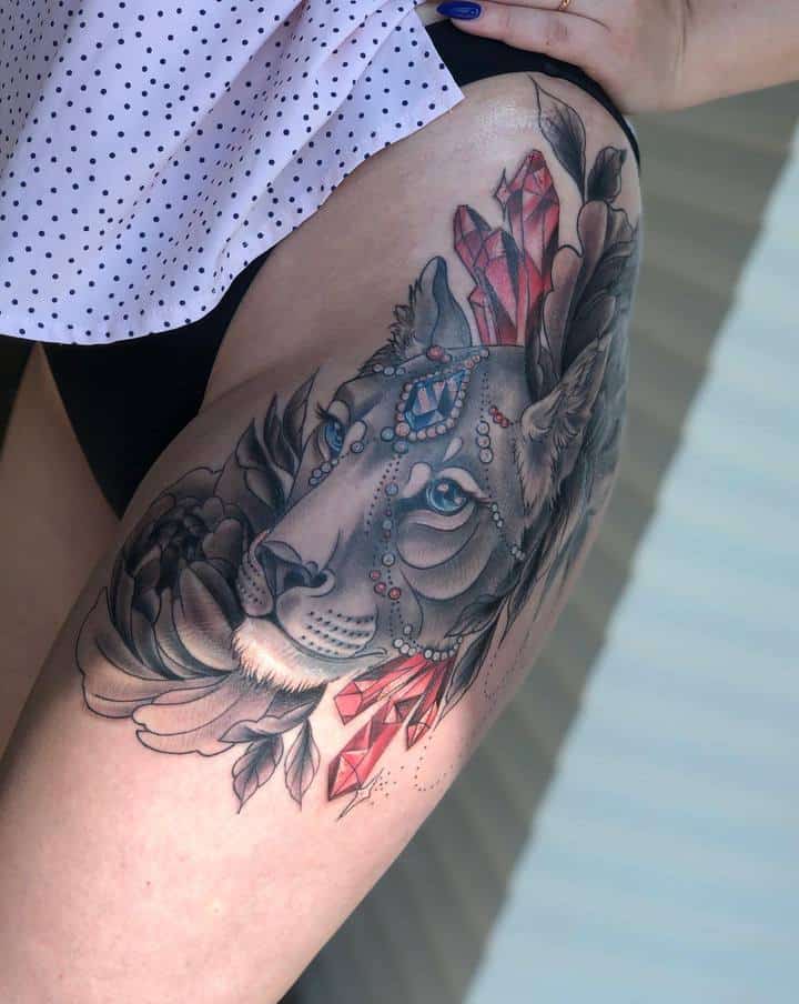 Однако в большинстве случаев дамы выбирают для такого тату открытые участки тела. Это связано с желанием владелицы намекнуть на высокое положение в обществе. Так что рисунки со львицами чаще имеют миниатюрные или средние размеры.