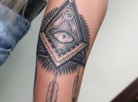 Самое популярное масонское тату глаз в треугольнике – этот рисунок представляет собой изображение человеческого глаза, размещенного в треугольнике на фоне лучей и/или наугольника (циркуля). Пожалуй, это самый знаменитый масонский символ в мире. Его можно увидеть в эскизах для тату, на зданиях, на денежных купюрах, ритуальных или мистических атрибутах и так далее.