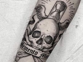 Довольно часто фраза выступает не отдельной татуировкой, а частью тату-композиции, либо в паре с какими-то символами. По смыслу и стилистике есть несколько тату-образов, которые можно удачно соединить с надписью Memento Mori.