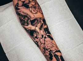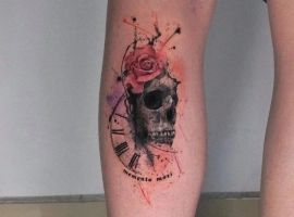 - Череп. «Помни о смерти» – значение фразы наилучшим образом сочетается с образами, символизирующими смерть. Больше всего ассоциируются с ней образы черепа и скелета. Учитывая современные техники нанесения татуировок, сегодня можно изобразить череп очень красиво. Например, в объемном стиле реализм. Очень гармонично будет сочетаться с фразой Memento Mori.