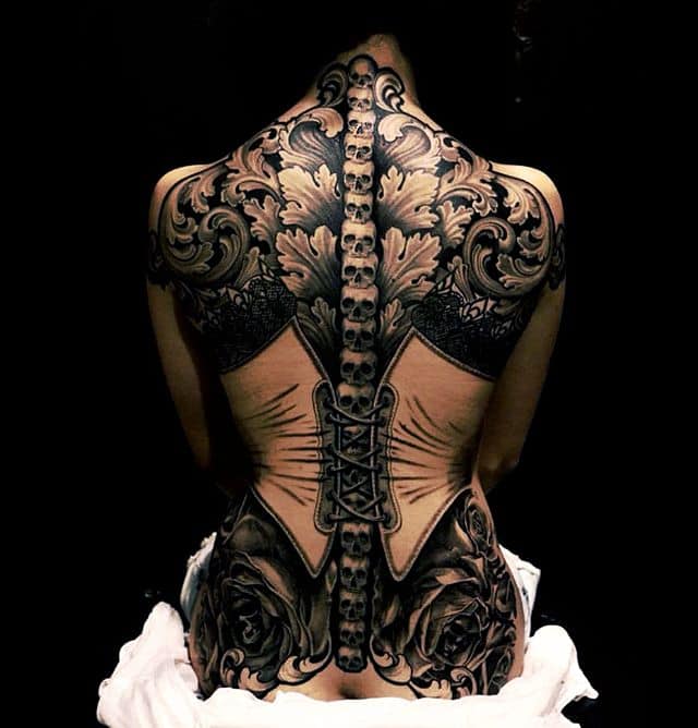 Американская фитнес-модель Джейми Бочерт славится элегантным змеиным скелетом, набитым вдоль позвоночника. Татуировка начинается в области поясницы и поднимается вдоль спинного мозга.