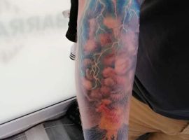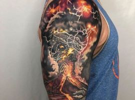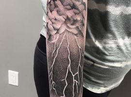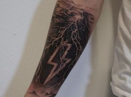 Отлично смотрится татуировка молнии в стиле реализм. Мастера детально порисуют каждый элемент в любой цветовой палитре. Довольно популярны интерпретации в черно-белой технике, геометрии, минимализме, скетч стайле, дотворке.