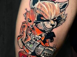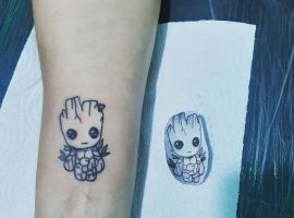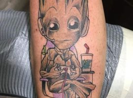 - излюбленным героем тату-любителей является Малыш Грут – милое маленькое живое деревце. В качестве нательного рисунка он всегда смотрится очень приятно и позитивно.