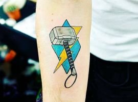 Тор – герой, обладающий огромным набором сверхспособностей, сил и качеств также очень любим тату-фанатами. В кино его исполнил красавец Крис Хемсворт и образ получился настолько гармоничным и эстетичным, что именно кадры из фильма и наносят на кожу в виде тату.