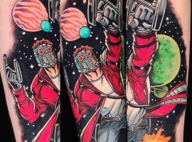 - Звездный Лорд. Персонаж яркий, позитивный и эффектный. Его изображение набивают харизматичные личности, уверенные в себе. Изображение космического вора предпочитают люди с авантюрным храктером.