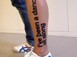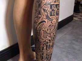 Татуировка в виде надписи может располагаться и на ноге. При этом они бывают как небольшие, так и массивные, занимающие всю голень или переднюю часть бедра. В ряде случаев предложения на большом пространстве могут казаться слишком куцыми, поэтому их комбинируют с иными формами.