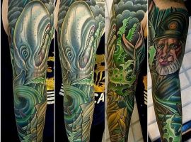 - Тату-рукав у мужчин охватывает руку полностью или частично, позволяя постепенно дополнять дизайн без дискомфорта.