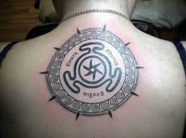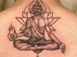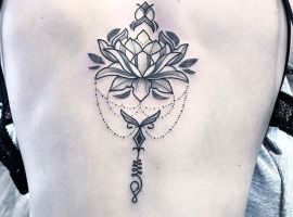 Самая оригинальная и в то же время логичная идея для тату вдоль позвоночника – это изображение чакр. В восточной культуре считается, что именно в позвоночнике расположена духовная энергия человека – кундалини, сосредоточенная в семи основных энергетических центрах – чакрах. Первая или Муладхара, расположена в районе копчика. Ее изображают в виде четырехлистного красного цветка лотоса. Вторая Свадхистхана находится в области крестца и выглядит как оранжевый цветок с шестью лепестками. Третья Манипура находится в солнечном сплетении и имеет вид желтого цветка с десятью лепестками. Четвертая сердечная чакра Анахата расположена в районе сердца и изображается как зеленый цветок с двенадцатью лепестками. Выше наносят еще три чакры: голубую Вишудху, синюю Аджну и фиолетовую Сахасрару. Внутри каждой чакры написан определенный символ – соответствующая центру мантра.