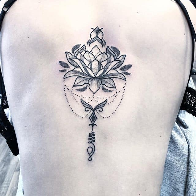 Самая оригинальная и в то же время логичная идея для тату вдоль позвоночника – это изображение чакр. В восточной культуре считается, что именно в позвоночнике расположена духовная энергия человека – кундалини, сосредоточенная в семи основных энергетических центрах – чакрах. Первая или Муладхара, расположена в районе копчика. Ее изображают в виде четырехлистного красного цветка лотоса. Вторая Свадхистхана находится в области крестца и выглядит как оранжевый цветок с шестью лепестками. Третья Манипура находится в солнечном сплетении и имеет вид желтого цветка с десятью лепестками. Четвертая сердечная чакра Анахата расположена в районе сердца и изображается как зеленый цветок с двенадцатью лепестками. Выше наносят еще три чакры: голубую Вишудху, синюю Аджну и фиолетовую Сахасрару. Внутри каждой чакры написан определенный символ – соответствующая центру мантра.