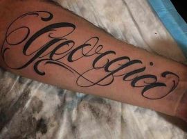 Стиль олд-скуд предполагает грубоватые начертания букв и яркие оттенки. Слова, при этом могут размещаться на определенном фоне – на ленте, которую удерживают две ласточки. В такой стилистике могут делаться как мужские татуировки, так и варианты для девушек. Если она будет сделана в стиле нью-скул, буквы могут быть написаны таким образом, словно их нанесли краской из баллона на стену.