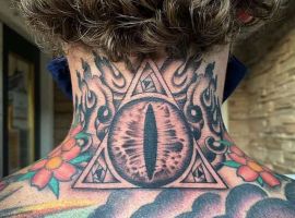 - Глаз – популярная татуировка, часто изображаемая на затылке в стиле реализм. Подходит проницательному, пытливому, интеллектуальному человеку. Означает умение понимать ситуации, видеть людей насквозь.