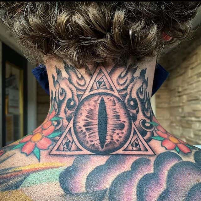 - Глаз – популярная татуировка, часто изображаемая на затылке в стиле реализм. Подходит проницательному, пытливому, интеллектуальному человеку. Означает умение понимать ситуации, видеть людей насквозь.