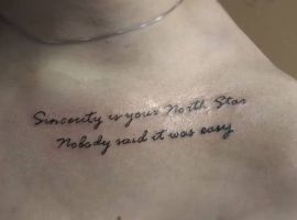 Надпись – это классический вариант татуировки на ключице. Эта тонкая кость лучше всего подходит для красивой цитаты. Такие идеи – это стремление быть понятым, способ донести до окружающих свои убеждения, жизненные ценности, мечты и желания. Они могут отражать жизненное кредо человека, приоритеты, особенности его характера.