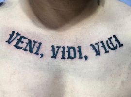 Среди представителей сильного пола также популярны тату надписи со смыслом на латыни. Мужчинам важно, чтоб с переводом передавались и подчеркивались мужские качества: сила как внешняя, так и внутренняя, сила духа, уверенность, отвага, целеустремленность и мудрость. Также в моде фразы – девизы. Своеобразные постулаты, с которыми человек идет по жизни, то, что для него самое главное, личное и особенное. Но если девушки воплощают такие идеи в миниатюре в скрытых местах, то молодым людям наоборот нравится наносить объемные, большие надписи на открытых местах. Чаще всего выбирают: руку, плечо, грудь, спину, бедро и голень.
