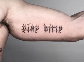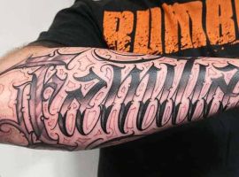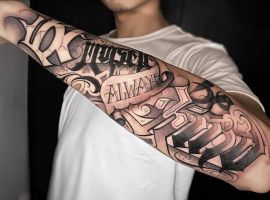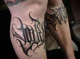 Опытные мастера легко помогут подобрать эскизы тату надписи, или же создать их самостоятельно, выбрав подходящий шрифт непосредственно перед сеансом. Парни отдают предпочтение грубым шрифтам, с толстыми, чеканными, резкими линиями и углами. В последнее время в моде стиль – Леттеринг. При этом, если девичьи надписи часто сопровождаются рисунками, цветами и узорами; то мужские обычно – это отдельная самодостаточная татуировка. Конечно, если речь не идет о рукаве (полностью забитой руке от плеча до запястья), в таком случае множество рисунков должны быть объединены одним стилем и сочетаться между собой. То же самое касается тех, кто хочет забить полностью всю спину, грудь, бок или ногу множеством картинок и элементов, создав объемную композицию.
