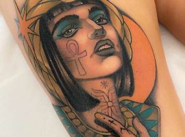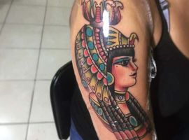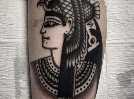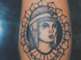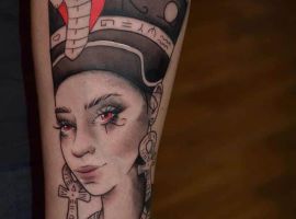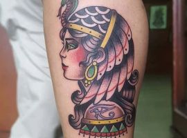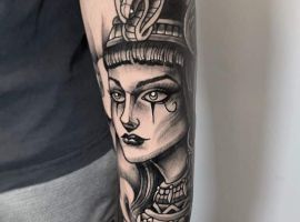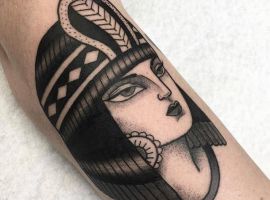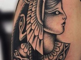 Клеопатра – реальная личность, поэтому ей не чужды земные наслаждения. Через тысячелетия дошла до нас история преданной любви царицы и полководца Марка Антония. Ещё одно значение такой тату – преданность в любви своему партнёру, готовность к самопожертвованию. Известный факт биографии Клеопатры: не желая быть пленницей, она выбрала самоубийство. Человек с рисунком царицы Древнего Египта может заявлять о своём свободолюбии, не терпимости каких-то ограничений, запретов.