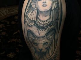 Кошка. Символ свободы, независимости, но в то же время и ответственности. Для Древнего Египта была неприкосновенным животным, ей поклонялись как божеству. Дополняя изображение Нефертити и Клеопатры египетской кошкой, обладатель тату говорит о своём умении достигать цели вопреки препятствиям и предрассудкам.