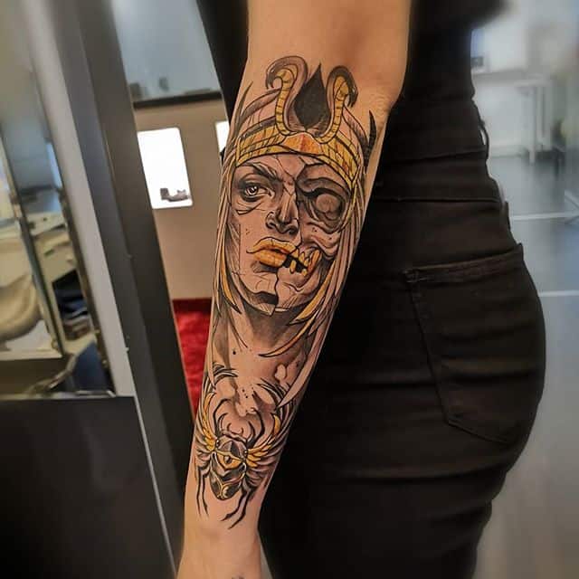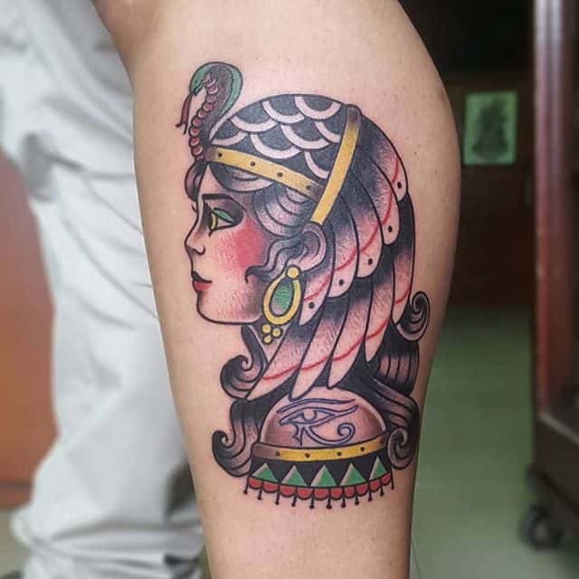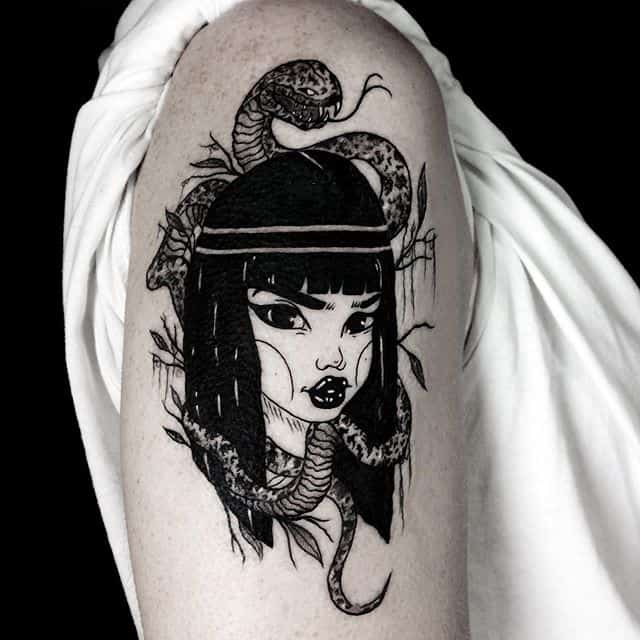 Клеопатра – реальная личность, поэтому ей не чужды земные наслаждения. Через тысячелетия дошла до нас история преданной любви царицы и полководца Марка Антония. Ещё одно значение такой тату – преданность в любви своему партнёру, готовность к самопожертвованию. Известный факт биографии Клеопатры: не желая быть пленницей, она выбрала самоубийство. Человек с рисунком царицы Древнего Египта может заявлять о своём свободолюбии, не терпимости каких-то ограничений, запретов.