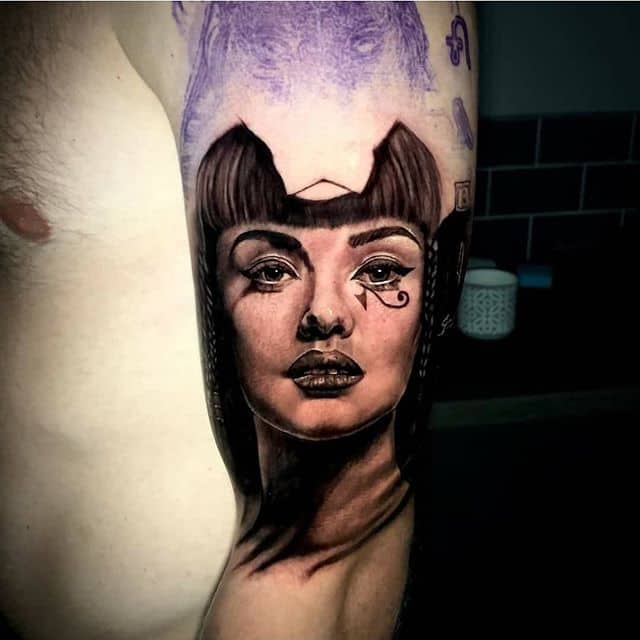 Кошка. Символ свободы, независимости, но в то же время и ответственности. Для Древнего Египта была неприкосновенным животным, ей поклонялись как божеству. Дополняя изображение Нефертити и Клеопатры египетской кошкой, обладатель тату говорит о своём умении достигать цели вопреки препятствиям и предрассудкам.