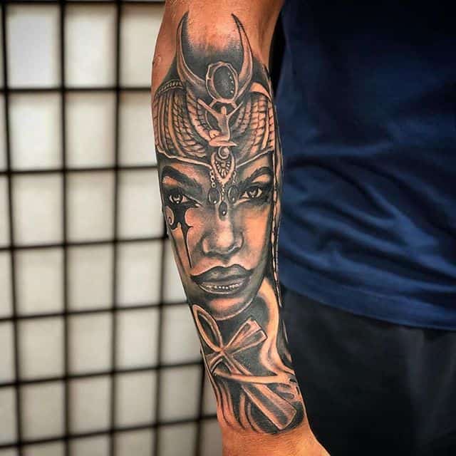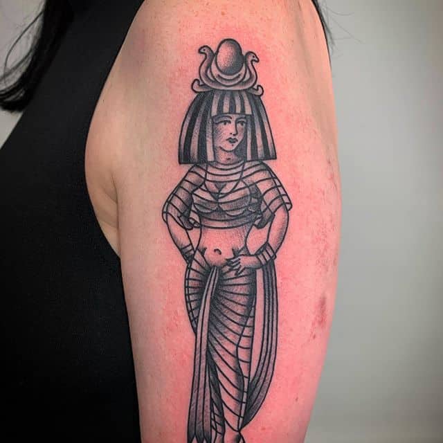 Надпись. Нередко тату с царицами Древнего Египта сопровождают надписи с использованием древнеегипетских иероглифов. Каждый знак содержит своё абстрактное значение, и его выбор зависит от того, что хочет показать носитель татуировки.